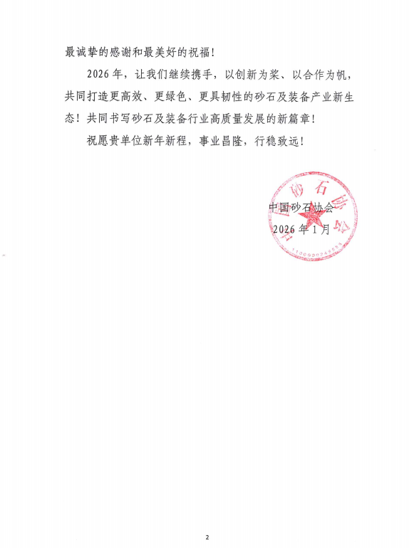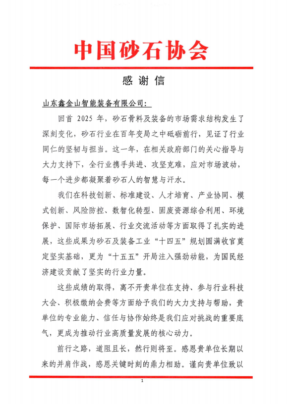 近日,山東鑫金山智能裝備有限公司收到中國砂石協(xié)會發(fā)來的感謝信。鑫金山對此致以誠摯謝意,這份認可既是對企業(yè)深耕行業(yè)的肯定,也是對全體員工的莫大鼓舞。