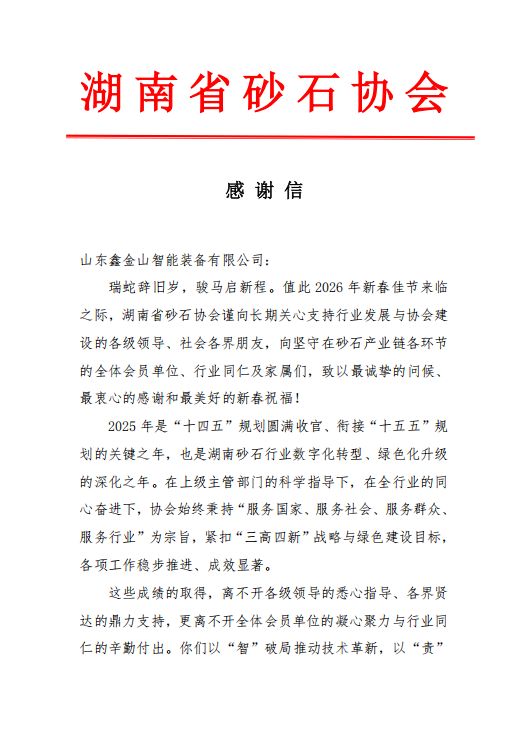 瑞蛇辭舊歲,駿馬啟新程。2026 年新春佳節(jié)來臨之際,山東鑫金山智能裝備有限公司收到湖南省砂石協(xié)會發(fā)來的感謝信,字里行間的認(rèn)可與期許,讓我們倍感溫暖與鼓舞。