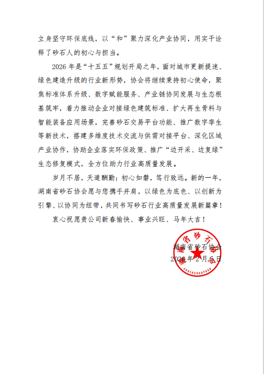 導(dǎo)讀:新春獲嘉許 瑞蛇辭舊歲,駿馬啟新程。2026 年新春佳節(jié)來臨之際,山東鑫金山智能裝備有限公司收到湖南省砂石協(xié)會發(fā)來的感謝信,字里行間的認(rèn)可與期許,讓我們倍感溫暖與鼓舞。