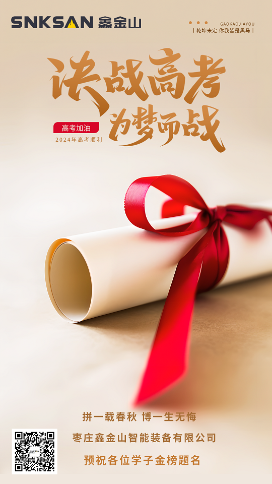 在這高考來(lái)臨的重要時(shí)刻,棗莊鑫金山智能裝備有限公司衷心地為所有高考學(xué)子送上最真摯的祝福!愿你們?cè)诳紙?chǎng)上如勇士般,以堅(jiān)定的信念和無(wú)畏的勇氣,迎接每一道試題的挑戰(zhàn)。愿你們多年的努力與付出,在這一刻綻放出最璀璨的光芒。相信自己的實(shí)力,以冷靜沉穩(wěn)的心態(tài)發(fā)揮出最佳水平。高考不是終點(diǎn),而是新的起點(diǎn),愿你們都能邁向?qū)儆谧约旱妮x煌未來(lái),加油,少年們!期待你們凱旋,書(shū)寫(xiě)人生的精彩篇章!
